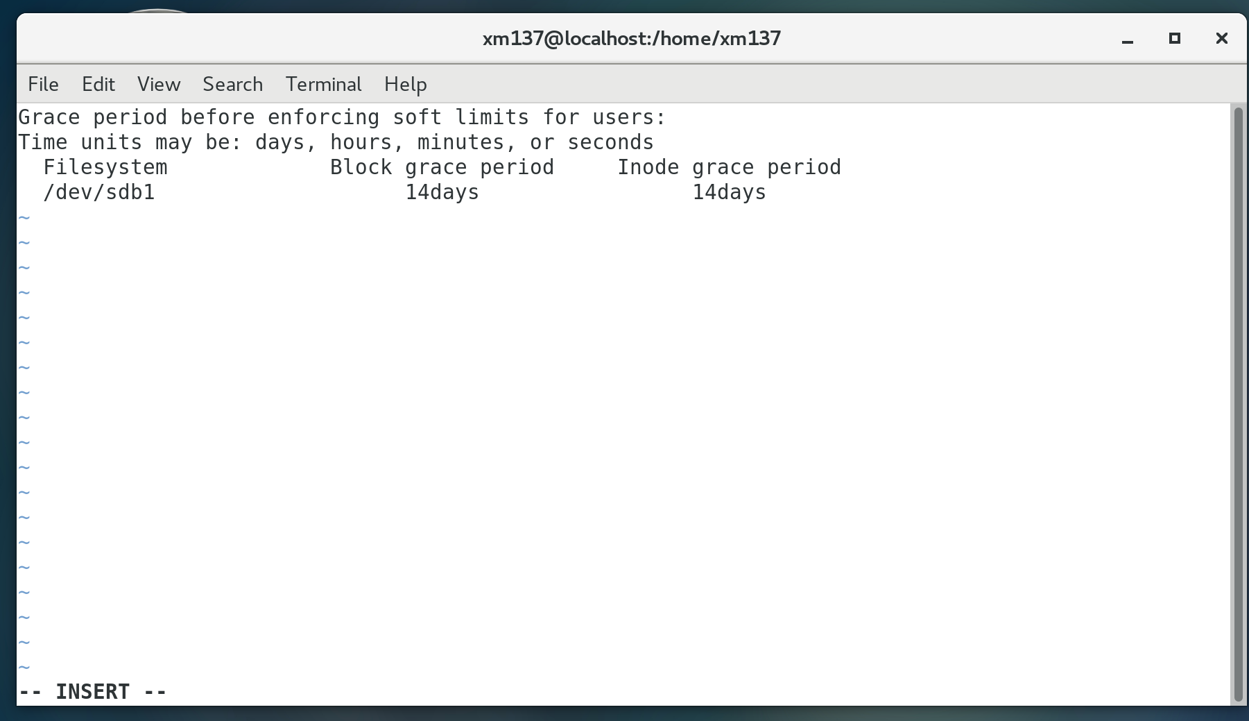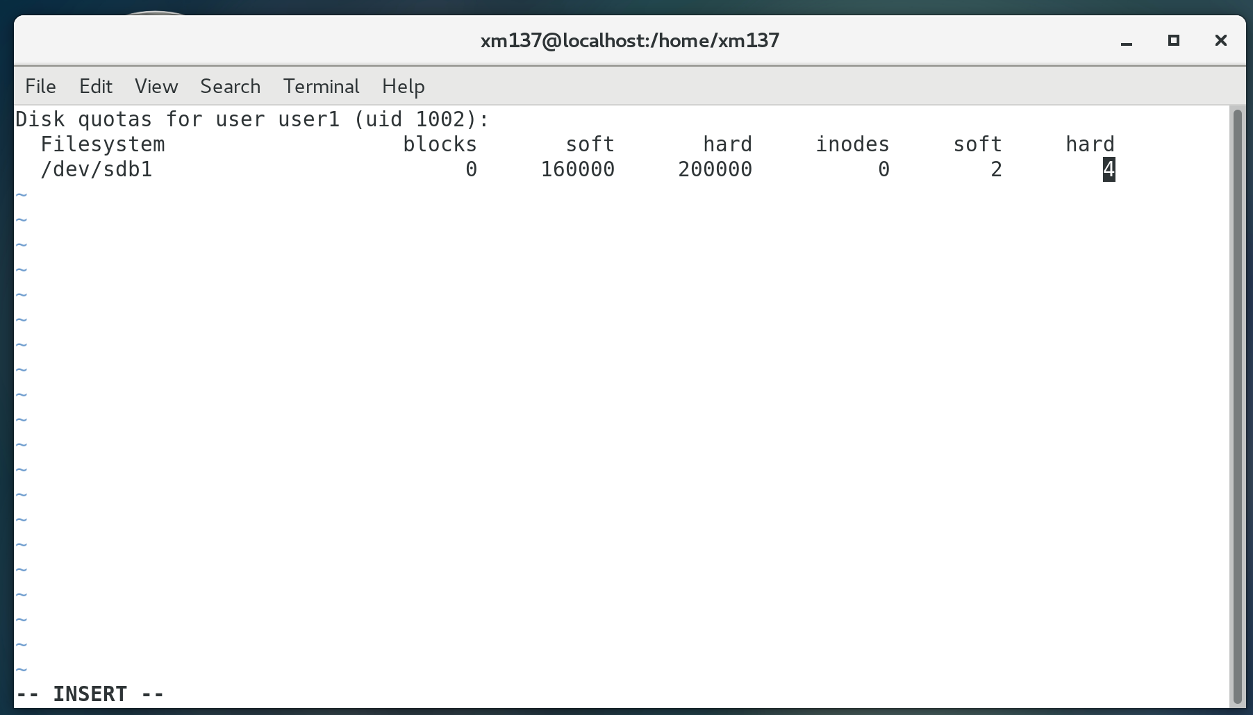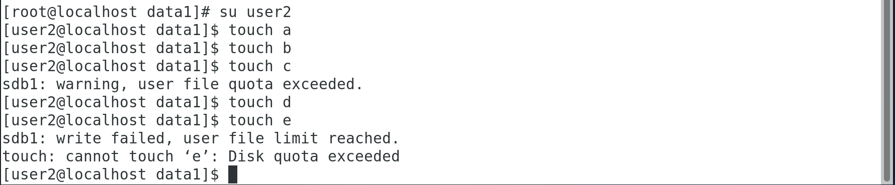 2) 每个用户最多存放4个文件(hard),超过2个文件(soft)开始警告。