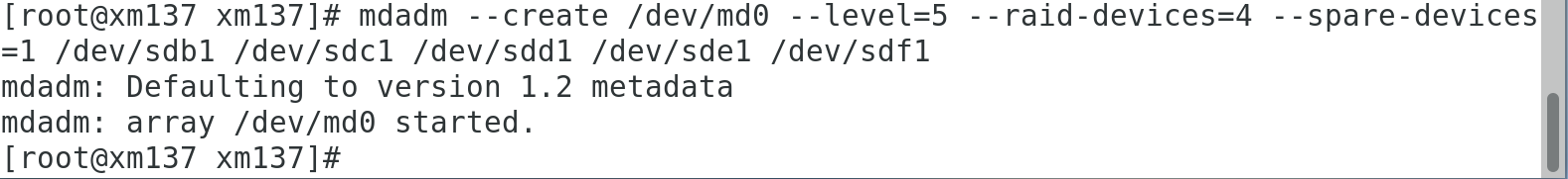 mdadm --create /dev/md0 --level=5 --raid-devices=4 --spare-devices=1 /dev/sdb1 /dev/sdc1 /dev/sdd1 /dev/sde1 /dev/sdf1