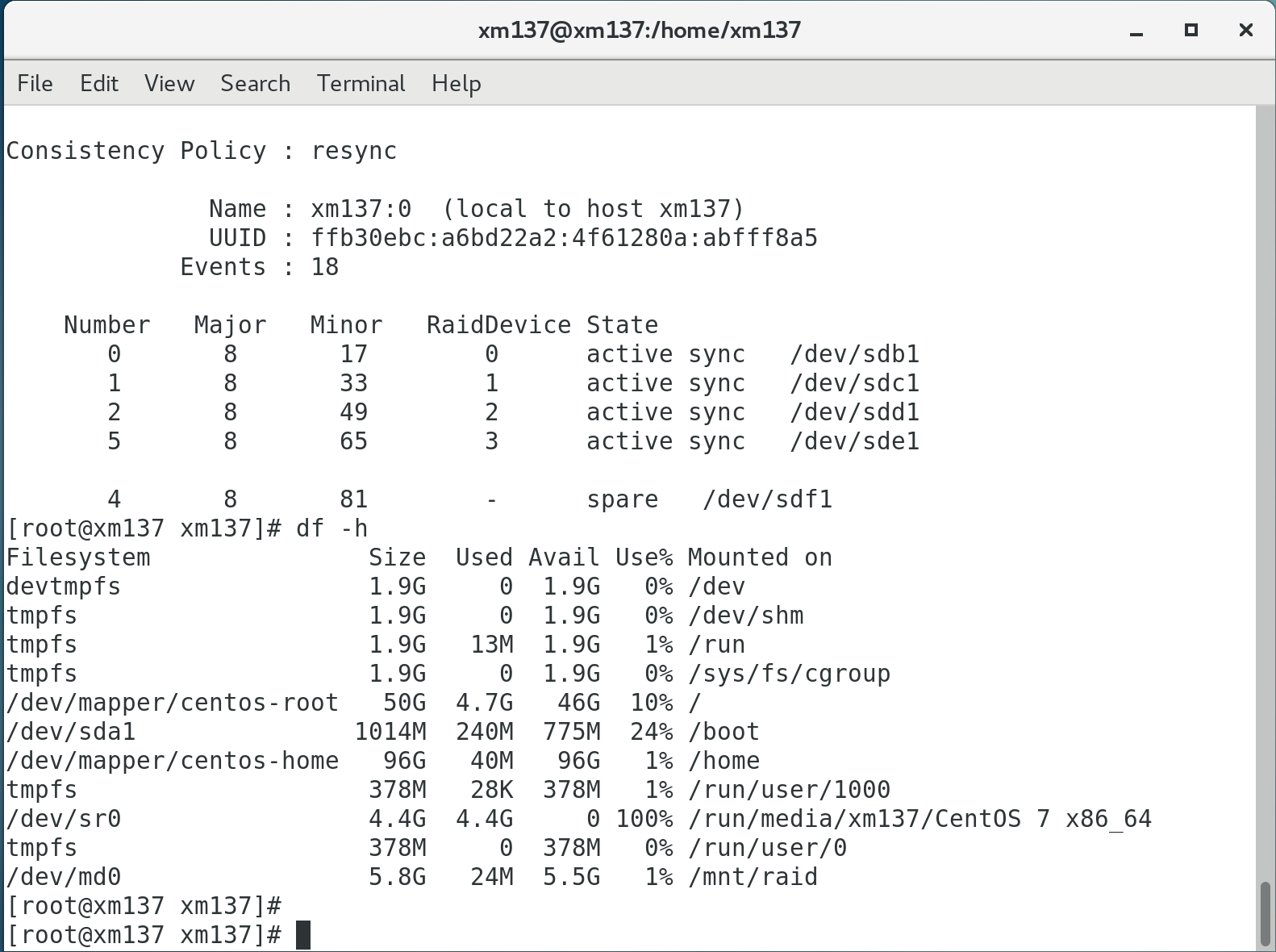 提交要求:提交 mdadm –detail /dev/md0 的返回结果截图和 df -h的返回结果截图