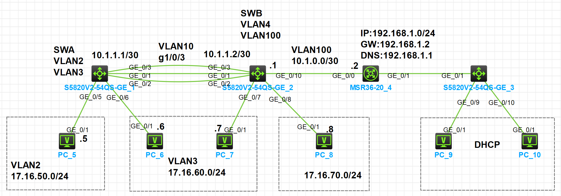 按照拓扑图连接设备,并配置命令,使PC5、PC6、PC7、PC8、PC9与PC10之间互通。
