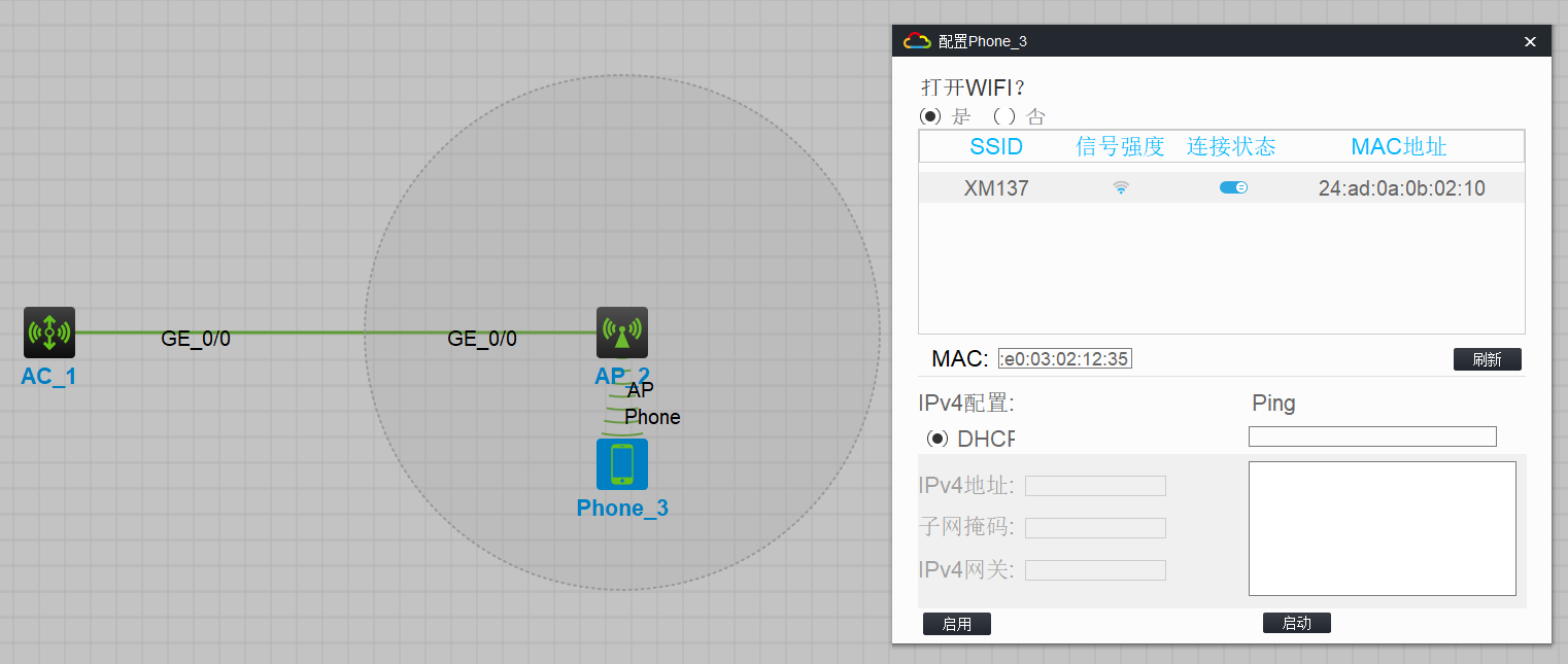 注意:当前没有配置任何DHCP所以使用模拟设备只能够扫描而不能获取到地址